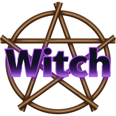 A spooky Goth inspired black text "Witch" glowing with gradient violet. Behind the text isof a brown rustic upwards pentagram made of sticks. emoji