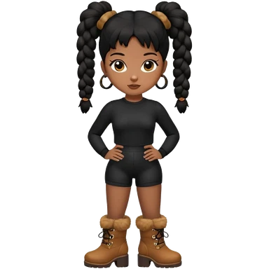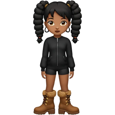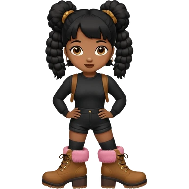 A brown skin girl thats slim and thick body with black hair into two puffy pigtails and wears all black outfit with brown furry boots emoji
