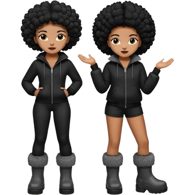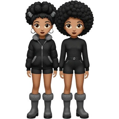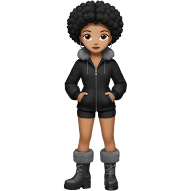 A brown skin girl that has a slim and thick body with black hair into two Afro puffs and wears all black outfit with grey furry boots emoji