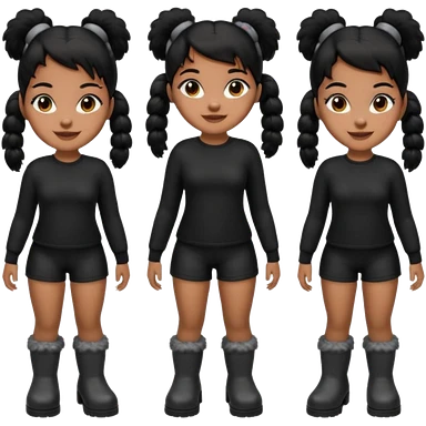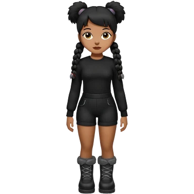 A brown skin thats slim and thick body with black hair into two pigtails and wears all black outfit with gray furry boots emoji | AI Emoji Generator
