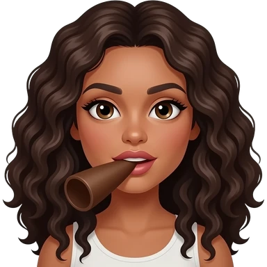 A brown woman with dark long curly hair and big lips sucking on a big brown cylinder emoji