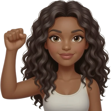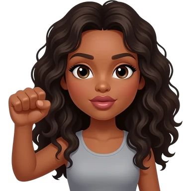 A brown woman with dark long curly hair and big pouting lips Holding her hand up with closed fist emoji