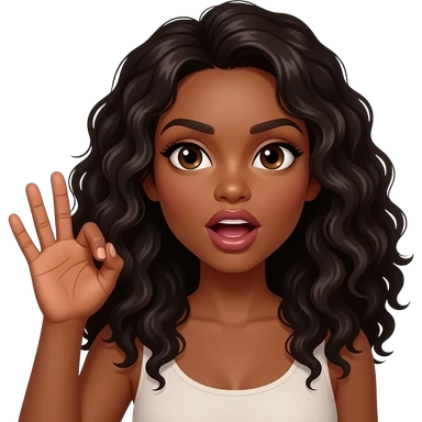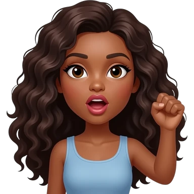 A brown woman with dark long curly hair and big pouting lips Holding her hand up with an open fist. Mouth needs to be open emoji
