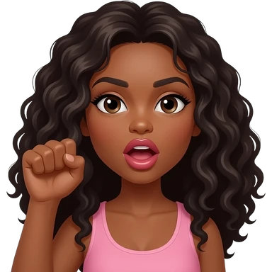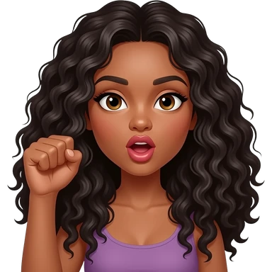 A brown woman with dark long curly hair and big pouting lips Holding her hand up with an open fist. Mouth needs to be open. Eyes looking at fist emoji