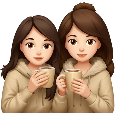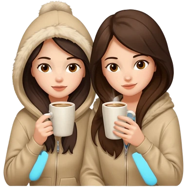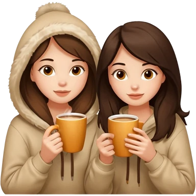 2 brunette girls sitting cozily in a beige fur hoodie sipping coffee emoji