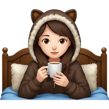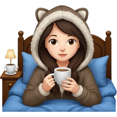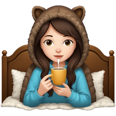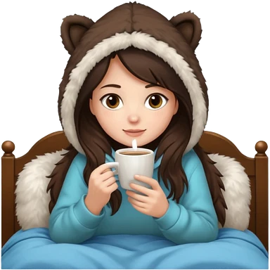 a brunette girl sitting cozily in her bed and a fur hoodie sipping coffee emoji