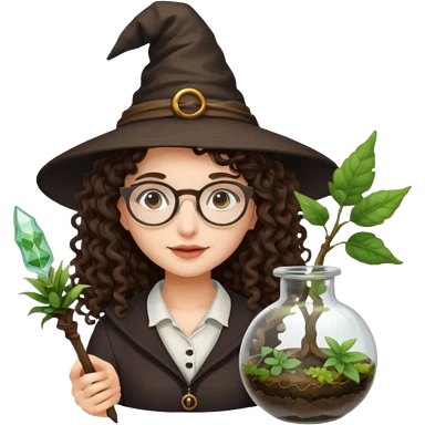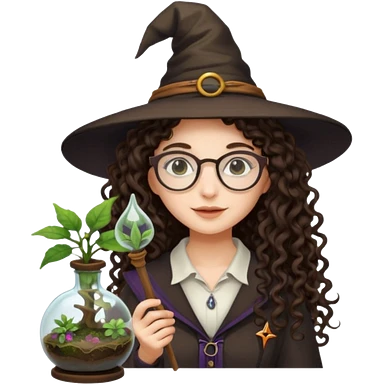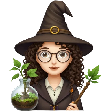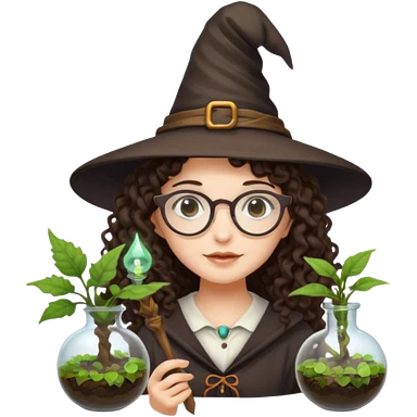 A long curly haired brunette girl with a witch hat, round white glasses, and a plant wand or plant potion terrarium emoji