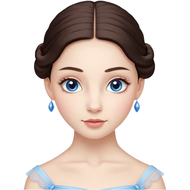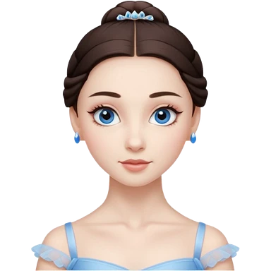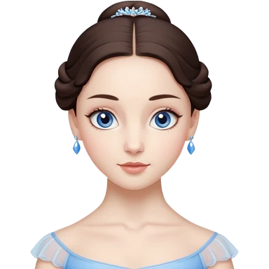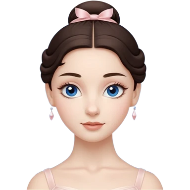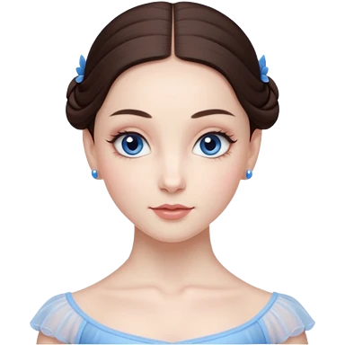 Realistic Ballerina Portrait, with porcelain-like skin featuring a natural rosy flush, illuminated by soft lighting that highlights the gentle contours of her face. Her Brunette hair flows in soft.Her deep blue eyes radiate framed by arched brows and long lashes. emoji
