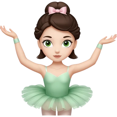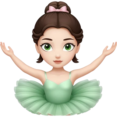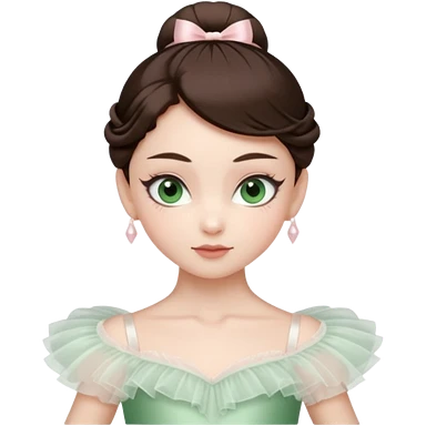 Realistic Ballerina Portrait, with porcelain-like skin featuring a natural rosy flush, illuminated by soft lighting that highlights the gentle contours of her face. Her Brunette hair flows in soft.Her deep green light eyes radiate framed by arched brows and long lashes. emoji