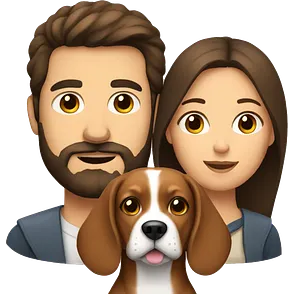 Brunette woman and brunette man with beard with a mixed race brown and black and white dog emoji