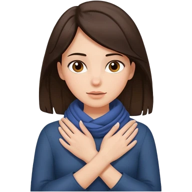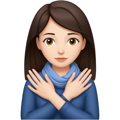 a brunette woman with two hands wrapped opposite around her neck emoji