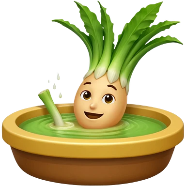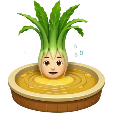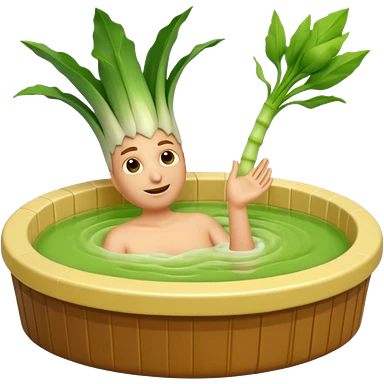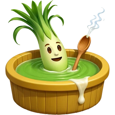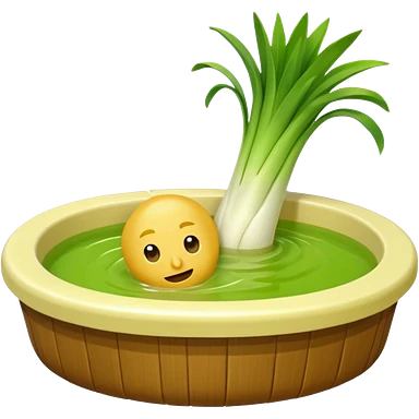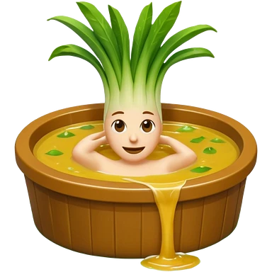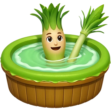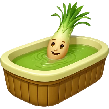 Create a 3D emoji of a relaxed leek in a jacuzzi filled with a slightly lumpy, yellowish-brown sauce emoji