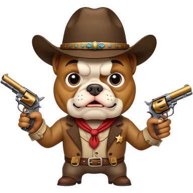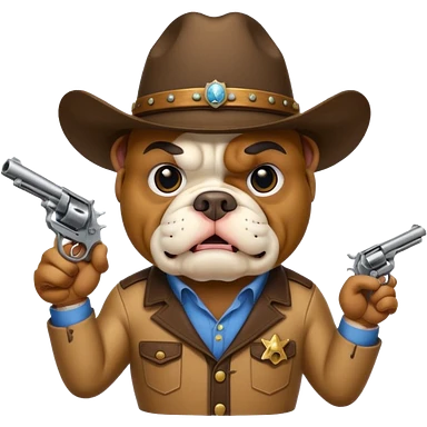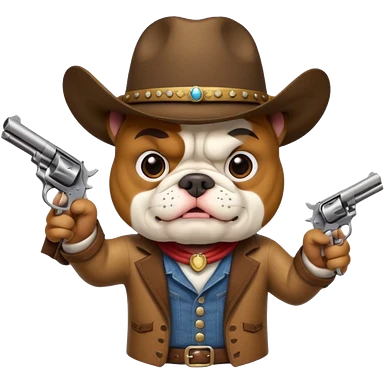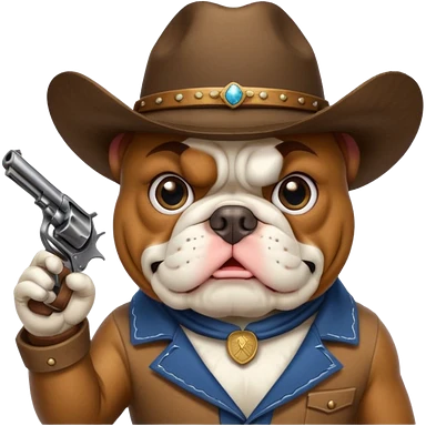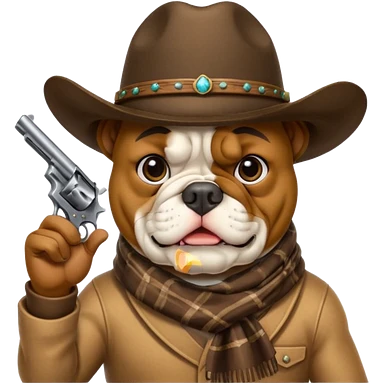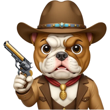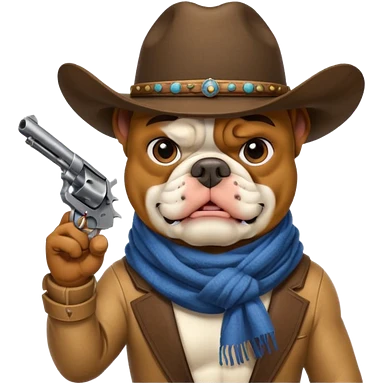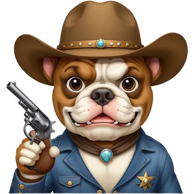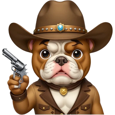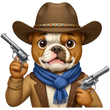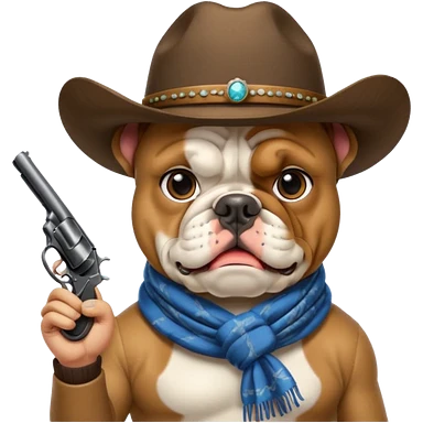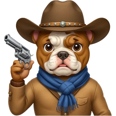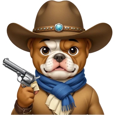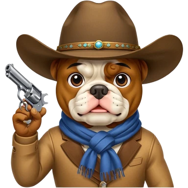 A bulldog wearing a cowboy hat, covering his face with a scarf so he wouldn't be recognized, pointing a revolver at you, telling you to hand over your money. emoji