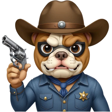 A bulldog wearing a cowboy hat, wearing a mask, pointing a revolver at you and telling you to hand over your money. emoji | AI Emoji Generator