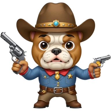 A bulldog wearing a cowboy hat pointing a revolver at you and telling you to hand over your money. emoji