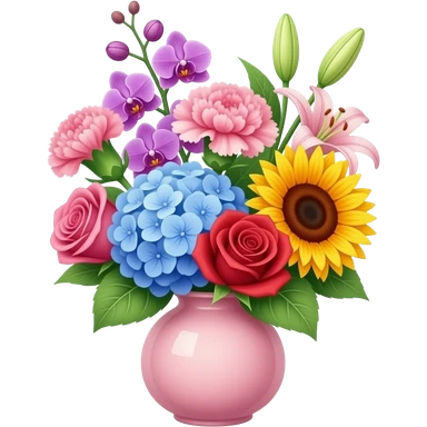 a bunch of flowers in a vase with a orchid, a carnation, a hydrangea, a rose, a sunflower and a lily emoji