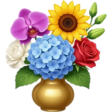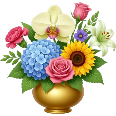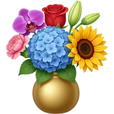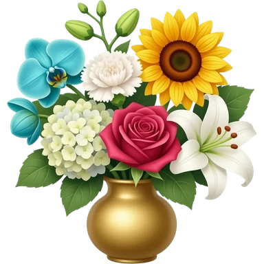 a bunch of flowers in a gold vase with a purple orchid, a white carnation, a blue hydrangea, a red rose, a sunflower and a lily emoji