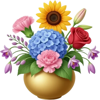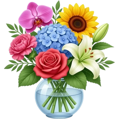 a bunch of flowers in a tall silver vase with little purple orchids, a pink carnation, a blue hydrangea, a red rose, a sunflower and a lily emoji | AI Emoji Generator