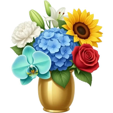 a bunch of flowers in a gold vase with a teal orchid, a white carnation, a blue hydrangea, a red rose, a sunflower and a lily emoji
