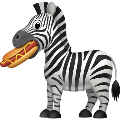 Cartoon zebra side view, holding hot dog in mouth, simple bun and sausage. emoji