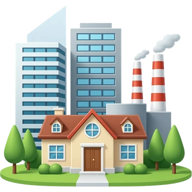 a house and tall office buildings and a factory, with simple white background emoji