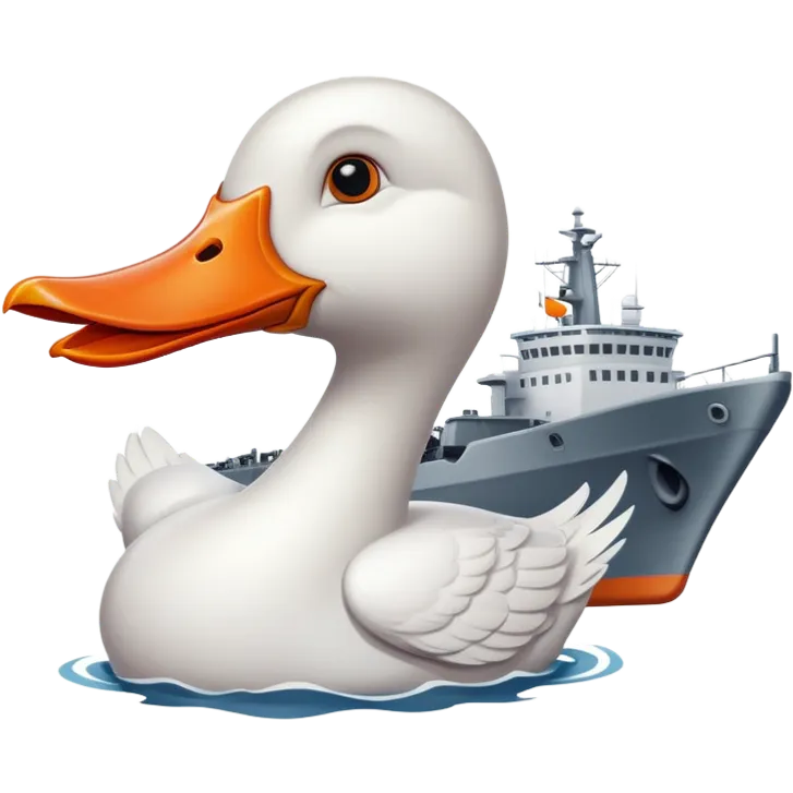 A cartoon military ship with planes on the deck and a large white goose head with orange bill at the front emoji | AI Emoji Generator