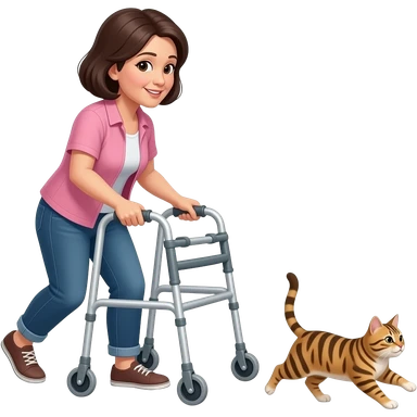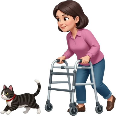 Middle aged, dark haired woman using walker chasing a tabby cat emoji