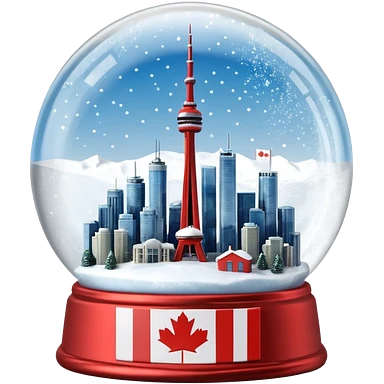 A Tiny beautiful hyperrealistic Glass Snow globe, with Toronto City CN tower within the global, full of snow, with canadian flag, expressing a snow storm in ontario. "TORONTO 2026" Craved into the metal label on front. Isolated, 3D render emoji