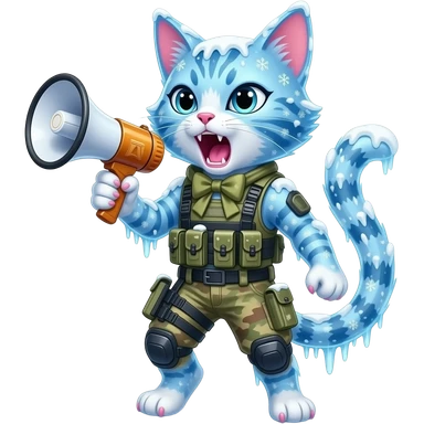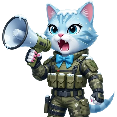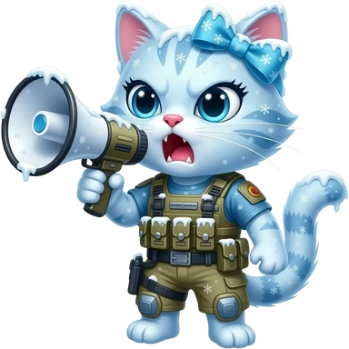 a sleek pretty cat made from ice snow & snowflakes and covered from frost. the cat is wearing a bow on head, frost-covered modern warfare gear & using a megaphone to yell. the cat has long eyelashes & pink claws & furious snarling outraged expression and pointing emoji