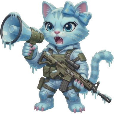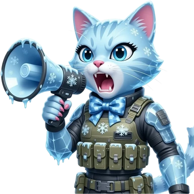 a sleek pretty female angry snarling cat which is made from ice snow and snowflakes and covered from frost. the cat is wearing a bow, modern warfare gear is using a megaphone to yell. their clothing and weapons are covered in frost and icicles. the cat has long eyelashes and pink claws emoji