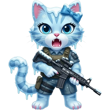 a sleek pretty female cat which is made from ice snow and snowflakes and covered from frost. the cat is wearing modern warfare gear and weaponry and is yelling angrily. their clothing and weapons are covered in frost and icicles. the cate is wearing a pretty bow, has long eyelashes and pink claws emoji