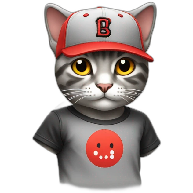 A cat standing up wearing a red and black squared shirt, and wearing a light grey Snapback cap emoji | AI Emoji Generator