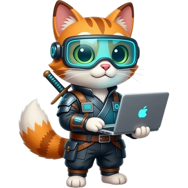 create an anonymous hacker emoji, having a laptop, and in that laptop display a set of hacking programming is running in the laptop display. make that emoji background is black. And also the face of the emoji looks like cute technical creative cat emoji