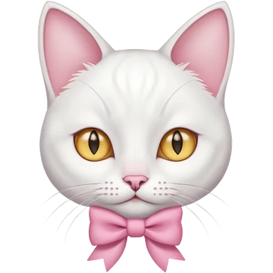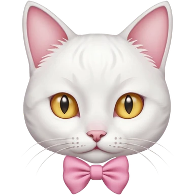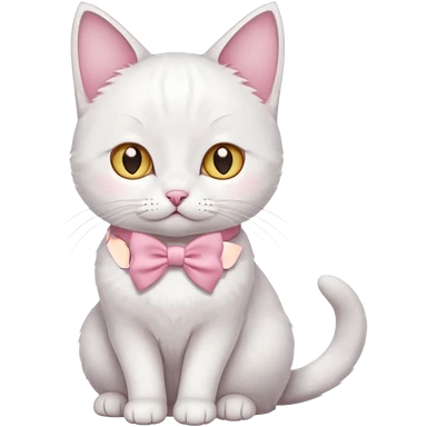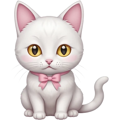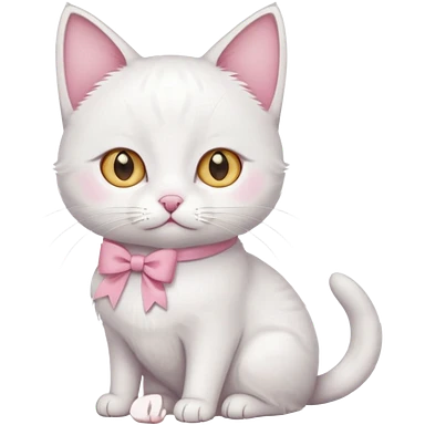 white cat sitting and she has a pink small bow on her right ear,she has golden eyes,she's fully white,even her ears,the only color is the pink small bow on her right ear,the cat is small emoji