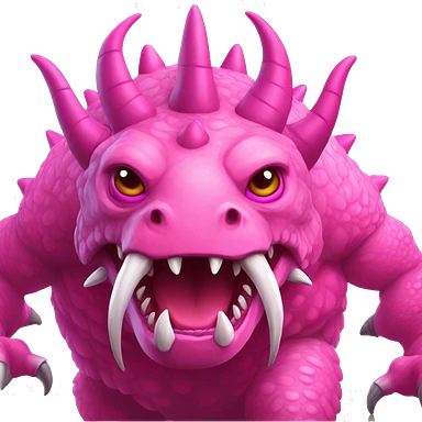A giant pink kaiju with a long neck, 2 bright pink tusks, horns and 10 spines. He has also 4 full dark pink eyes with no pupils, dark pink claws and he got 2 spines on its tail. emoji