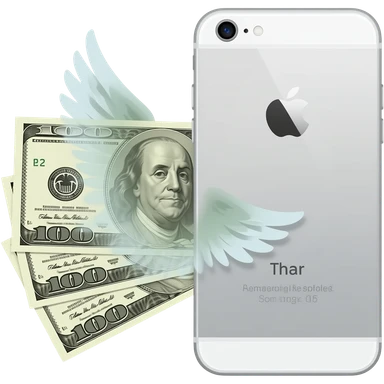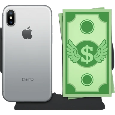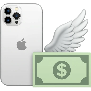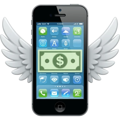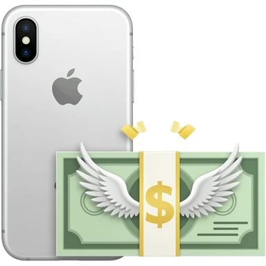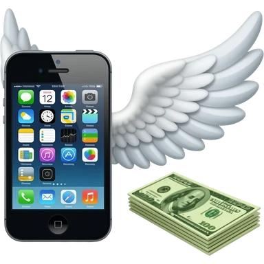 An iPhone, with a banknote with wings next to it emoji