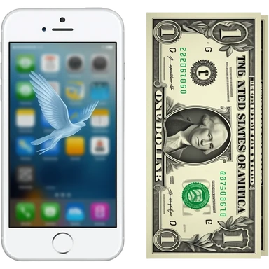 A banknote with wings lies next to a white iPhone 5s emoji