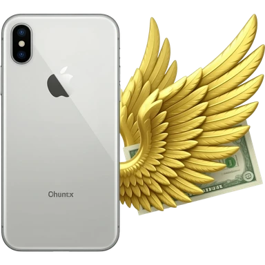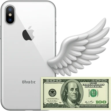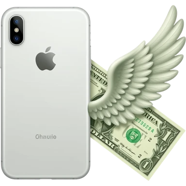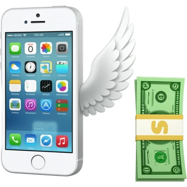 A white iPhone, with a banknote featuring wings lying next to it emoji