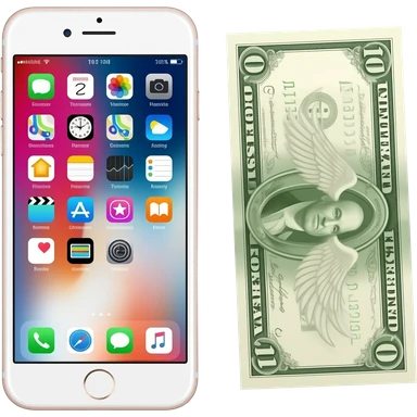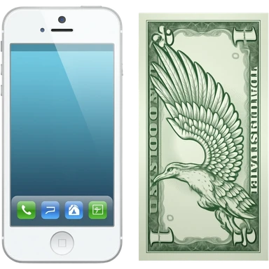 An iPhone next to a banknote with wings emoji