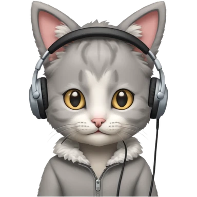 a small grey kitten sitting on a seat and wearing headphones and there is a sims logo over her head emoji