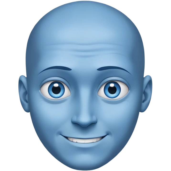 a character with blue skin and a huge forehead - twice the size of the face, the shape of the head is like a rounded inverted triangle. He has a smooth bald head. a sly, intelligent smile. Close-up. Blue eyes emoji | AI Emoji Generator