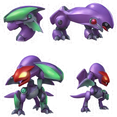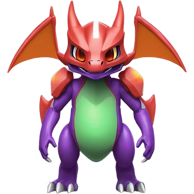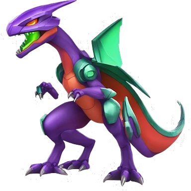 a shiny purple-green-red Genesect-Charizard-Raptor-Fakémon—hybrid with a futuristic visor-helmet full body emoji