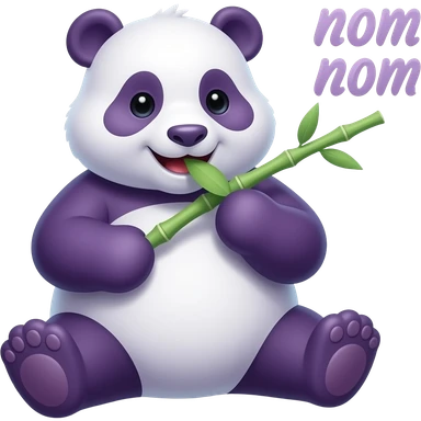 A chubby purple panda happily crunching on a bamboo leaf with "nom nom" text in a playful font floating nearby. Simple 2D illustration, expressive happy eyes, bright colors, high-quality sticker design. emoji