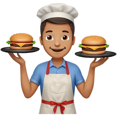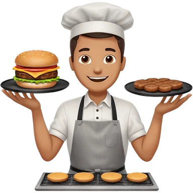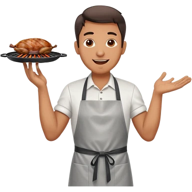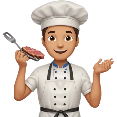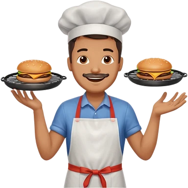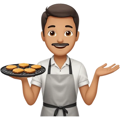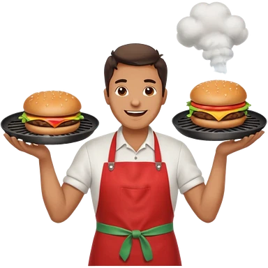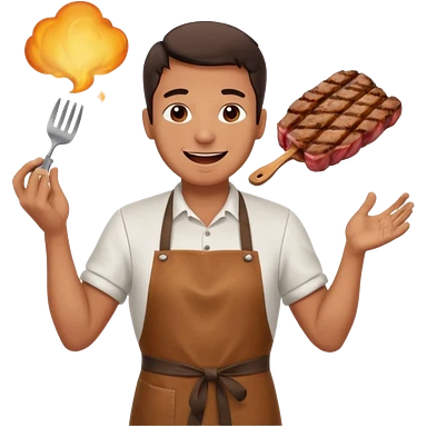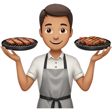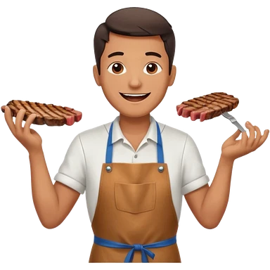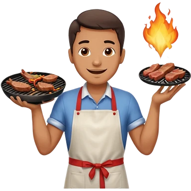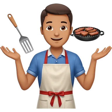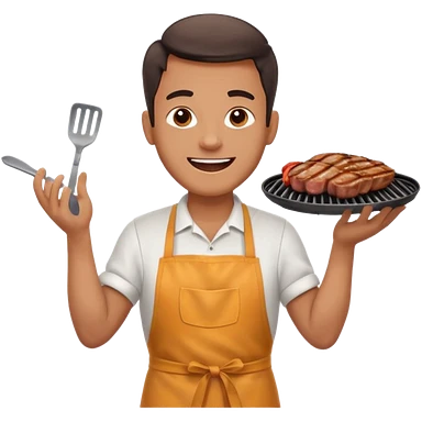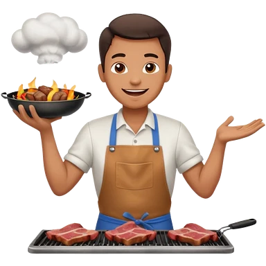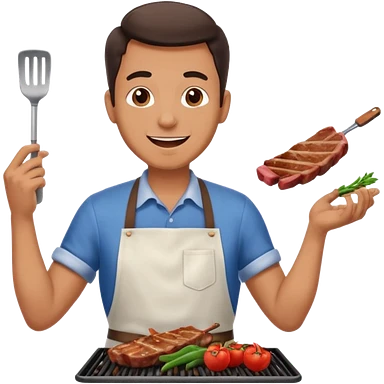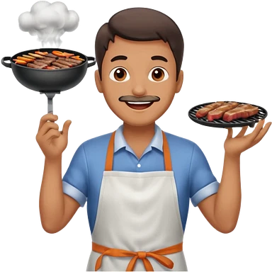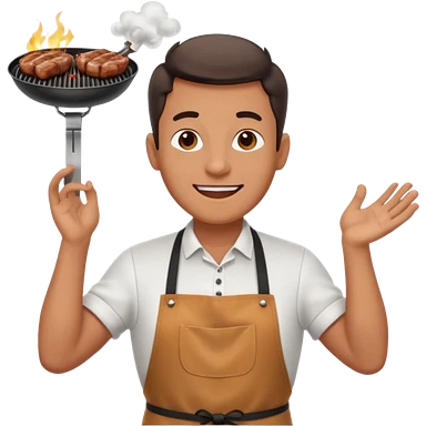 A cheerful man in an apron flipping meat on a sizzling grill with smoke puffing upward. emoji | AI Emoji Generator