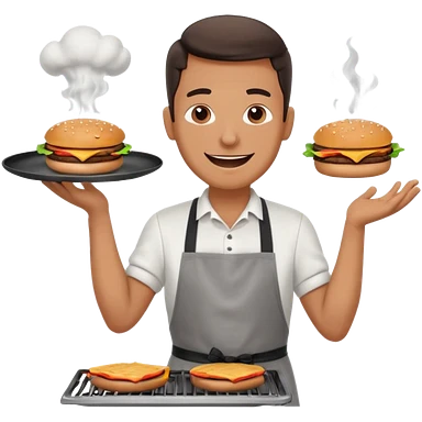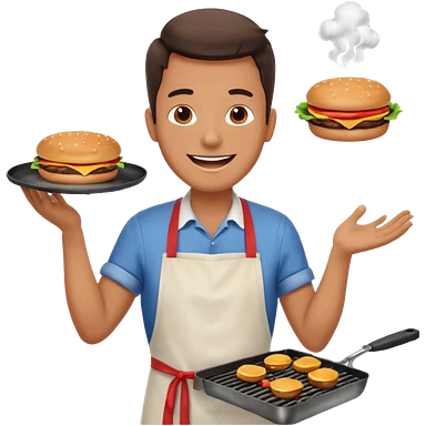 A cheerful man in an apron flipping burgers on a sizzling grill with smoke puffing upward. emoji