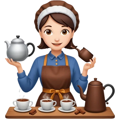 A cheerful woman wearing a winter apron, pouring cocoa from a kettle into tiny cups. emoji | AI Emoji Generator