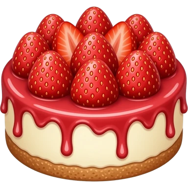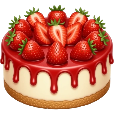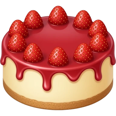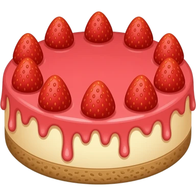 A big full circle Cheese cake with gram cracker crust and a strawberry with strawberry purée drizzle emoji