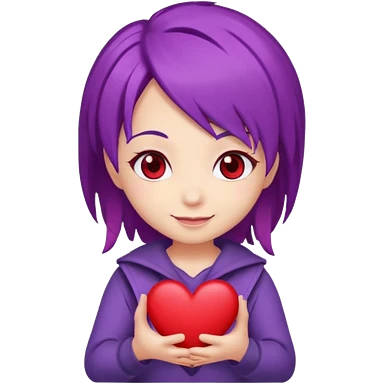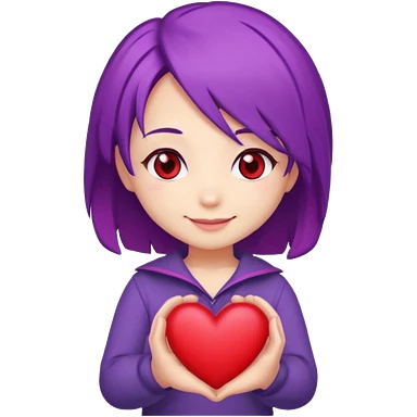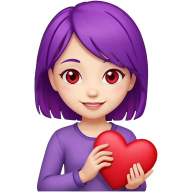 A chibi cartoon with purple hair red eyes holding a heart emoji