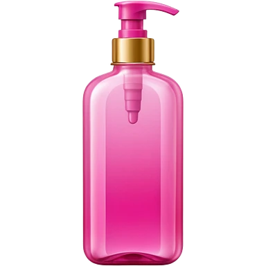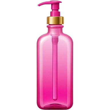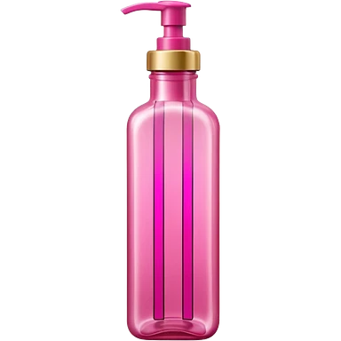 A tall, translucent bottle in a vibrant pink shade with a glossy finish. It has a rectangular shape with rounded edges and a thick base. The pump-style cap is metallic pink. In the center, there are curved graphic elements and vertical lines, with text in white and gold. emoji
