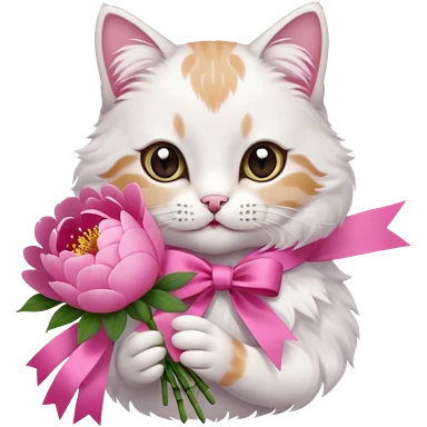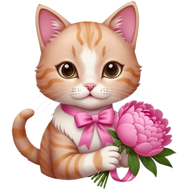Can you make a cute cat handing out peonies bouquet with a coquette on the boquette emoji